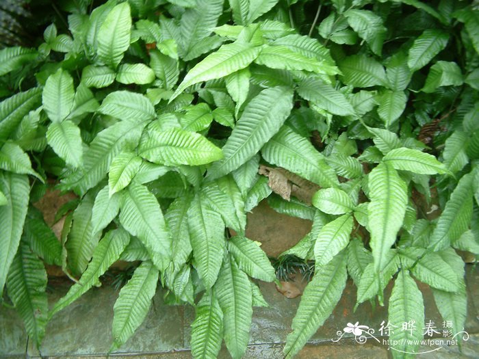 形态特征(Description):根状茎粗而横走,密被鳞片;鳞片卵状披针形,灰棕色,盾状着生,近全缘。叶近生,相距约1厘米;叶柄长15厘米或更长,禾秆色,疏被鳞片,上面有沟;叶二型: 不育叶变化大,或为披针形的单叶,或为三出,或为一回羽状;顶生羽片特别长大,披针形,先端常有一延长能生根的鞭状长尾;侧生羽片1-5对,近无柄,阔披针形,长10-15厘米,宽3-4厘米,先端渐尖,基部圆楔形,边缘近全缘或呈浅波状而具少数疏刚毛状齿。侧脉明显;小脉联结成整齐的四角形或六角形网眼,网眼在侧脉之间排列成3行,无内藏小脉,近叶缘的小脉分离。叶薄草质,干后黑色。能育叶叶柄较长,叶片与不育叶同形而较小,孢子囊群初沿网脉分布,后满布能育叶下面。