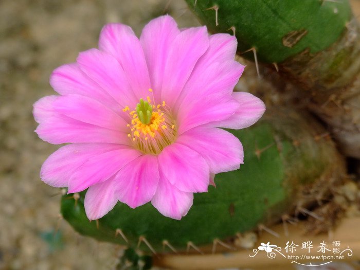 形态特征(Description):多年生常绿草本,茎单一或丛生,绿色,长达10厘米。具肋棱,5~7。具刺,1~3,黄色。花粉红或白色,漏斗状。浆果。花期春至夏。
