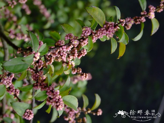 形态特征(Description):常绿灌木或小乔木,高3-4米;小枝纤细,近四棱形,灰褐色,密被长硬毛,具纵棱脊,无皮孔,具稍隆起、近新月形叶痕;顶芽通常发育不良或缺。叶生于1-2年生枝上,叶片纸质或膜质,椭圆形或长卵形,长2-6厘米,宽1-2.5(-3)厘米,先端急尖或短渐尖,基部钝,边缘具疏而尖的细锯齿或近全缘,叶面绿色,背面淡绿色,干时橄榄绿色或深橄榄色,两面被长硬毛,无光泽,背面沿主脉更密,主脉在叶面平坦或稍凹陷,背面隆起,侧脉4-5对,在叶面不明显,背面明显,在近叶缘附近网结,网状脉两面不明显;叶柄长2.5-5毫米,密被长硬毛。花序簇生于1-2年生枝的叶腋内,密被长硬毛。雄花序:簇的单个分枝具1或3花的聚伞花序,花梗长1.5-2毫米,基部具2枚小苞片,若3花时,总花梗长1-1.5毫米;花4或5基数,粉红色;花萼盘状,直径约2毫米,被长柔毛,5或6深裂,裂片卵状三角形,具缘毛;花冠辐状,直径4-5毫米,花瓣4-6枚,卵状长圆形或倒卵形,长约2毫米,先端圆形,基部稍合生;雄蕊长为花瓣的3/4,花药长圆形,长约0.8毫米;退化雌蕊垫状,顶端具短喙。雌花序:簇生,被长硬毛,单个分枝具单花,稀具3花,花梗长2-3毫米,基部具小苞片;花6-8基数;花萼盘状,直径约2.5毫米,6或7深裂,被长硬毛,急尖;花冠辐状,花瓣5-8枚,长圆形,长约2毫米,先端圆形;退化雄蕊长约为花瓣的一半,败育花药箭头形;子房卵球形,长约1.5毫米,直径约1.3毫米,无毛,花柱明显,柱头头状或厚盘状。果球形,直径约4毫米,成熟后红色,干时具纵棱沟,果梗长约4毫米,密被长硬毛;宿存花萼平展,直径约3毫米,裂片卵形,外面被毛;宿存柱头厚盘状或头状,花柱明显。分核6,稀5或7枚,轮廓椭圆体形,长约3毫米,背部宽约1毫米,两端尖,背面具纵宽的单沟及3条纹,两侧面平滑,内果皮革质或近木质。花期4-5月,果期8-11月。