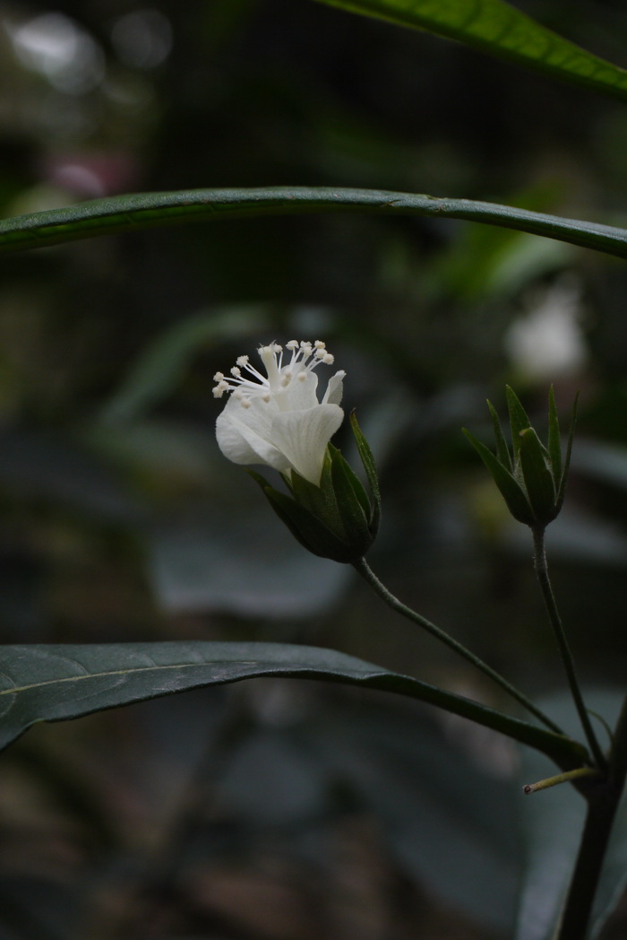 形态特征(Description):灌木,高约1-4m。叶片长卵形,前端宽,基部渐狭,无叶柄。花生于叶腋,单生,萼片绿色,花瓣白色。蒴果近球形。花期几乎全年。