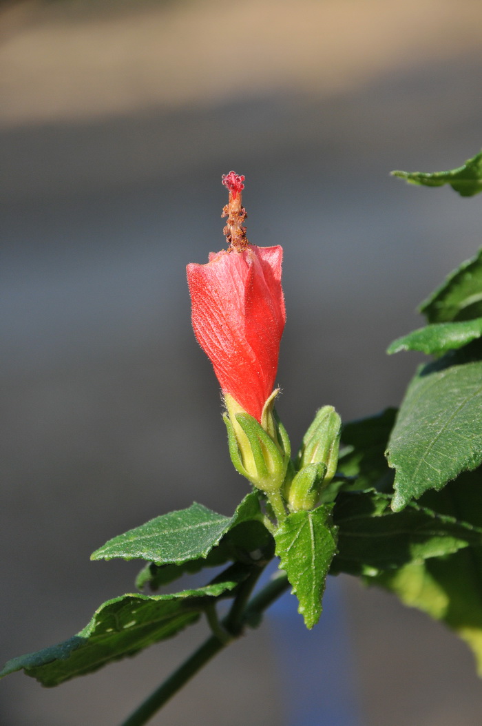 形态特征(Description):小灌木,高约1米;小枝圆柱形,被疏长柔毛。叶宽心形至圆心形,长7-10厘米,先端渐尖,基部心形,边缘具不规则钝齿,通常钝3裂,有时5裂,两面均疏被星状柔毛;主脉5;叶柄长2-5厘米,圆柱形,被柔毛;托叶线形,长约4毫米,常早落。花单生于叶腋间,花梗长3-4毫米,被柔毛;小苞片匙形,长8-10毫米,宽1-1.5毫米,被毛;萼钟形,裂片5,与小苞片近等长,被毛;花冠红色,长约2.5厘米,管状,花冠管直径1.2-1.5厘米,雄蕊柱长约5厘米,突出于花冠管外。果未见。