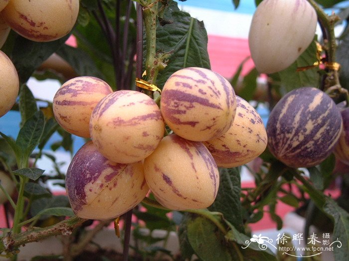 异名(Synonym):Solanum wallisii Carrière Solanum pedunculatum Roem. & Schult. Solanum guatemalense Hort. Solanum hebephorum Dunal Solanum melaniferum Moric. ex Dunal, nomen nudum Solanum variegatum Ruiz & Pav. Solanum saccianum Carrière & André, nomen nudum Solanum muricatum f. glaberrimum Correll Solanum muricatum var. dissectum Dunal Solanum muricatum var. papillosistylum Bitter Solanum muricatum var. parvifolium Kunth Solanum muricatum var. popayanum Bitter Solanum muricatum var. praecedens Bitter Solanum muricatum var. protogenum Bitter Solanum muricatum var. teleutogenum Bitter