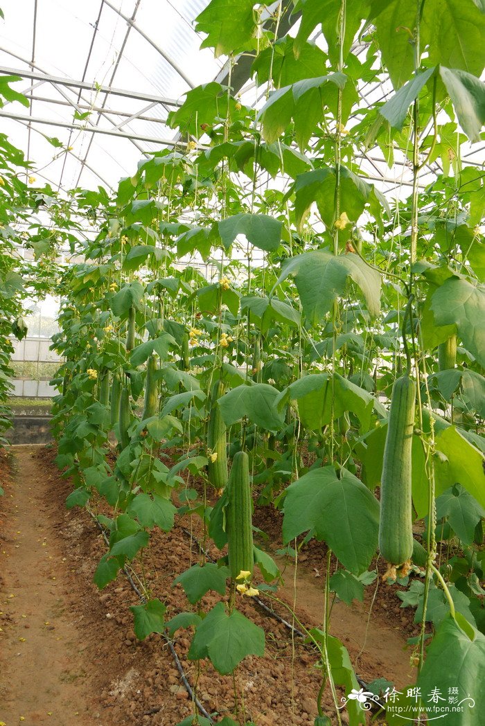 形态特征(Description):一年生攀援藤本;茎、枝粗糙,有棱沟,被微柔毛。卷须稍粗壮,被短柔毛,通常2-4歧。叶柄粗糙,长10-12厘米,具不明显的沟,近无毛;叶片三角形或近圆形,长、宽约10-20厘米,通常掌状5-7裂,裂片三角形,中间的较长,长8-12厘米,顶端急尖或渐尖,边缘有锯齿,基部深心形,弯缺深2-3厘米,宽2-2.5厘米,上面深绿色,粗糙,有疣点,下面浅绿色,有短柔毛,脉掌状,具白色的短柔毛。雌雄同株。雄花:通常15-20朵花,生于总状花序上部,花序梗稍粗壮,长12-14厘米,被柔毛;花梗长1-2厘米,花萼筒宽钟形,径0.5-0.9厘米,被短柔毛,裂片卵状披针形或近三角形,上端向外反折,长约0.8-1.3厘米,宽0.4-0.7厘米,里面密被短柔毛,边缘尤为明显,外面毛被较少,先端渐尖,具3脉;花冠黄色,辐状,开展时直径5-9厘米,裂片长圆形,长2-4厘米,宽2-2.8厘米,里面基部密被黄白色长柔毛,外面具3-5条凸起的脉,脉上密被短柔毛,顶端钝圆,基部狭窄;雄蕊通常5,稀3,花丝长6-8毫米,基部有白色短柔毛,花初开放时稍靠合,最后完全分离,药室多回折曲。雌花:单生,花梗长2-10厘米;子房长圆柱状,有柔毛,柱头3,膨大。果实圆柱状,直或稍弯,长15-30厘米,直径5-8厘米,表面平滑,通常有深色纵条纹,未熟时肉质,成熟后干燥,里面呈网状纤维,由顶端盖裂。种子多数,黑色,卵形,扁,平滑,边缘狭翼状。花果期夏、秋季。