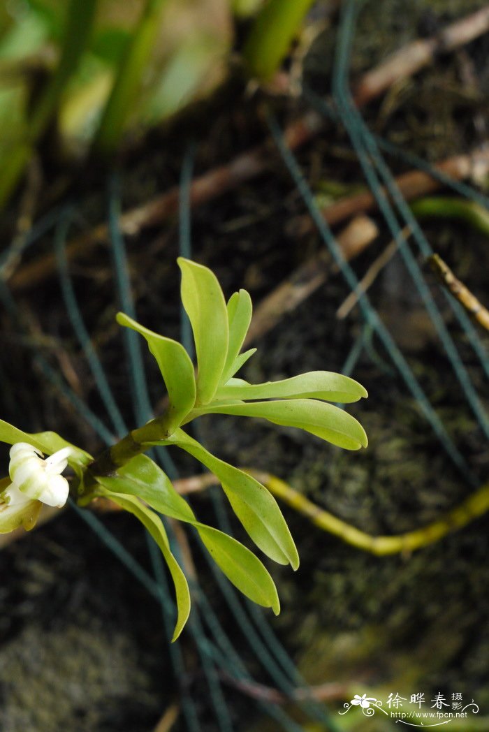 形态特征(Description):茎直立或斜立,圆柱形,长约50厘米,粗约5毫米,上下等粗,具纵条棱,不分枝,具多数节;节间长约2厘米,被叶鞘所包裹。叶二列,紧密互生于整个茎上,舌状披针形,长4-5厘米,宽15-19毫米,先端钝并且不等侧2裂,基部心形抱茎并且下延为紧抱于茎的鞘。花白色,常单朵从具叶的老茎上部发出,与叶对生,具香气;花苞片小;花梗连同子房纤细,下弯,长约2厘米;中萼片反卷,卵状长圆形,长约8毫米,宽约5毫米,先端急尖;侧萼片反卷,长圆状披针形,长8毫米,宽5毫米,先端急尖;萼囊角状,长约7毫米;花瓣反卷,狭披针形,长7毫米,宽约4毫米,先端急尖;唇瓣肉质,比萼片大,3裂,沿中轴线多少下弯而折叠;侧裂片小,三角形,长约2毫米,先端锐尖;中裂片较大,近横长圆形或圆形,长10毫米,宽约15毫米,先端近截形而具宽凹缺,唇盘中部以上黄色,中央具3条褐紫色的龙骨脊。花期6月。