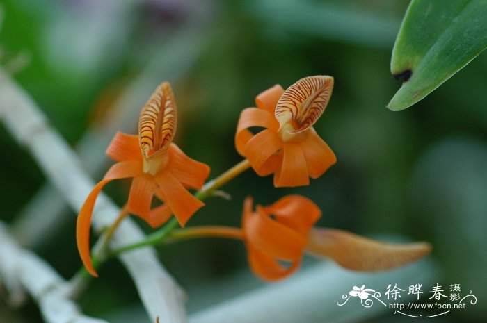 形态特征(Description):茎直立或斜立,圆柱形。叶二列,互生于茎上,长披针形。花着生于去年落叶的老茎上,1~2朵为一束,花瓣及萼片红色,反卷。唇瓣浅黄色,上具红色脉纹。个体花色有差异。花期冬至春。