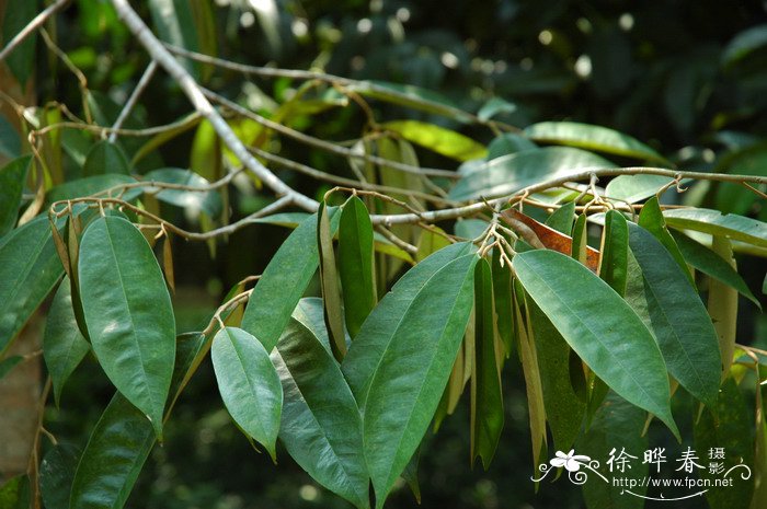 形态特征(Description):常绿乔木,株高可达25米。叶片长圆形,有时倒卵状长圆形,短渐尖或急渐尖,基部圆形或钝。聚伞花序细长下垂,每序有花3~30朵,花瓣黄白色。蒴果椭圆形,淡黄色或黄色。花果期6~12月。