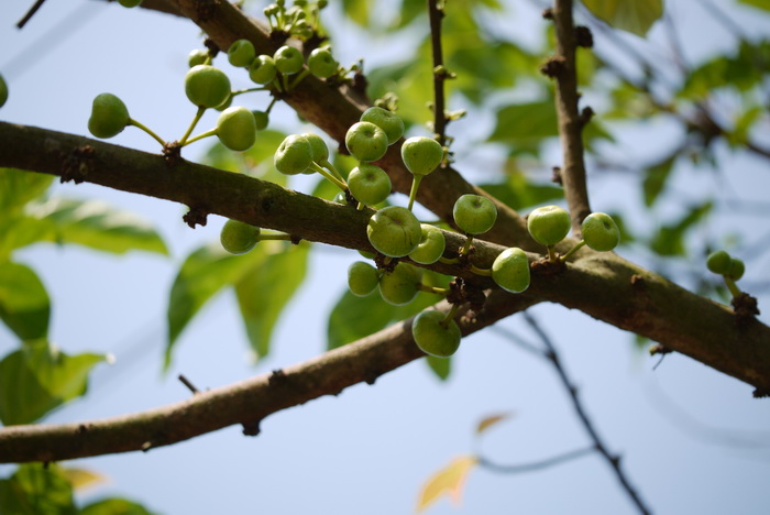 形态特征(Description):乔木,高7-10米,树皮灰褐色,平滑,胸径10-15(-17)厘米,幼枝绿色,微被柔毛。叶互生,厚纸质,广卵形至卵状椭圆形,长10-17厘米,顶端渐尖或钝,基部圆形至浅心形,边缘波状或具浅疏锯齿;幼叶背面被柔毛,基生叶脉5条,近基部的2条细小,侧脉4-6对;叶柄长2.5-6厘米,托叶卵状披针形,无毛,长1-1.5厘米。榕果簇生于老茎发出的瘤状短枝上,球形,直径2.5-3厘米,顶部微压扁,顶生苞片卵圆形,脐状微凸起,基生苞片3,早落,残存环状疤痕,成熟榕果红色,有绿色条纹和斑点;总梗长2-4厘米;雄花生榕果内壁口部,花被片3-4,宽卵形,雄蕊2,花丝基部合生成一柄;瘿花生内壁近口部,花被合生,管状,顶端4-5齿裂,包围子房,花柱侧生,短,柱头漏斗形;雌花生于雌植株榕果内壁,花被片3-4,条状披针形,薄膜质,基部合生。瘦果倒卵形,薄被瘤体,花柱与瘦果等长,柱头棒状,无毛。花期冬季。