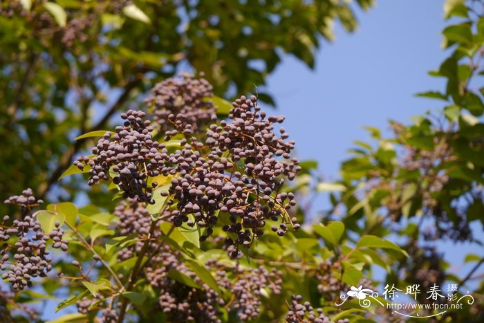 形态特征(Description):灌木或乔木,高可达25米;树皮灰褐色。枝黄褐色、灰色或紫红色,圆柱形,疏生圆形或长圆形皮孔。叶片常绿,革质,卵形、长卵形或椭圆形至宽椭圆形,长6-17厘米,宽3-8厘米,先端锐尖至渐尖或钝,基部圆形或近圆形,有时宽楔形或渐狭,叶缘平坦,上面光亮,两面无毛,中脉在上面凹入,下面凸起,侧脉4-9对,两面稍凸起或有时不明显;叶柄长1-3厘米,上面具沟,无毛。圆锥花序顶生,长8-20厘米,宽8-25厘米;花序梗长0-3厘米;花序轴及分枝轴无毛,紫色或黄棕色,果时具棱;花序基部苞片常与叶同型,小苞片披针形或线形,长0.5-6厘米,宽0.2-1.5厘米,凋落;花无梗或近无梗,长不超过1毫米;花萼无毛,长1.5-2毫米,齿不明显或近截形;花冠长4-5毫米,花冠管长1.5-3毫米,裂片长2-2.5毫米,反折:花丝长1.5-3毫米,花药长圆形,长1-1.5毫米;花柱长1.5-2毫米,柱头棒状。果肾形或近肾形,长7-10毫米,径4-6毫米,深蓝黑色,成熟时呈红黑色,被白粉;果梗长0-5毫米。花期5-7月,果期7月至翌年5月。