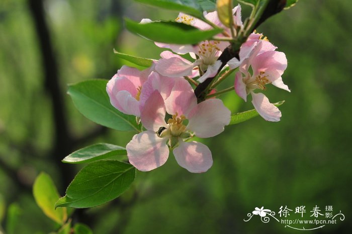 形态特征(Description):小乔木,高4-6米;小枝粗壮,圆柱形,嫩枝密被柔毛,老枝暗紫褐色,无毛,有稀疏浅色皮孔;冬芽卵形,先端急尖,初时密被柔毛,逐渐脱落,灰红色。叶片卵形或椭圆形,长5-11厘米,宽4-5.5厘米,先端急尖或渐尖,基部圆形或宽楔形,边缘有细锐锯齿,上面有短柔毛,逐渐脱落,下面密被短柔毛;叶柄长1.5-5厘米,具短柔毛;托叶小,膜质,披针形,早落。伞房花序,具花4-7朵,集生在小枝顶端;花梗长1.5-2厘米,密被柔毛;花直径3-4厘米;萼筒钟状,外面密被柔毛;萼片三角披针形,长4-5毫米,先端渐尖,全缘,内外两面密被柔毛,萼片比萼筒稍长;花瓣倒卵形或长圆倒卵形,长8-13毫米,宽4-7毫米,基部有短爪,淡粉色;雄蕊17-20,花丝长短不等,比花瓣短;花柱4 (-5),基部具长绒毛,比雄蕊较长。果实卵形或近球形,直径4-5厘米,黄色或红色,先端渐狭,不具隆起,基部陷入,宿存萼肥厚隆起。花期4-5月,果期8-9月。