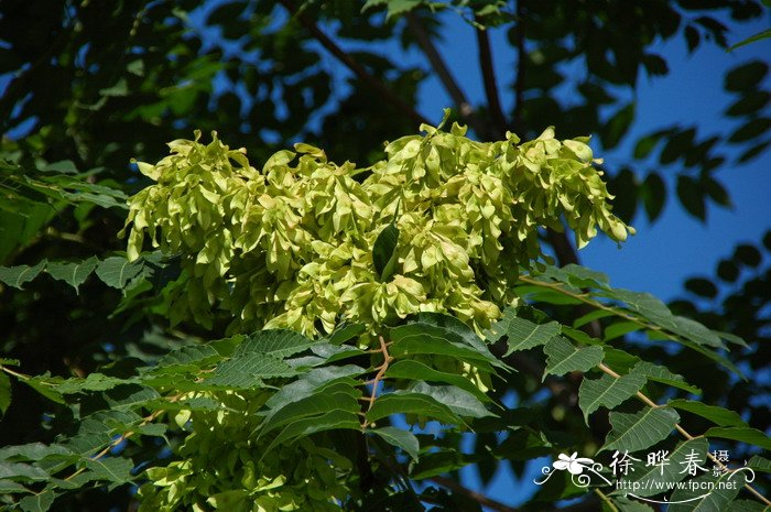 形态特征(Description):落叶乔木,高可达20余米,树皮平滑而有直纹;嫩枝有髓,幼时被黄色或黄褐色柔毛,后脱落。叶为奇数羽状复叶,长40-60厘米,叶柄长7-13厘米,有小叶13-27;小叶对生或近对生,纸质,卵状披针形,长7-13厘米,宽2.5-4厘米,先端长渐尖,基部偏斜,截形或稍圆,两侧各具1或2个粗锯齿,齿背有腺体1个,叶面深绿色,背面灰绿色,柔碎后具臭味。圆锥花序长10-30厘米;花淡绿色,花梗长1-2.5毫米;萼片5,覆瓦状排列,裂片长0.5-1毫米;花瓣5,长2-2.5毫米,基部两侧被硬粗毛;雄蕊10,花丝基部密被硬粗毛,雄花中的花丝长于花瓣,雌花中的花丝短于花瓣;花药长圆形,长约1毫米;心皮5,花柱粘合,柱头5裂。翅果长椭圆形,长3-4.5厘米,宽1-1.2厘米;种子位于翅的中间,扁圆形。花期4-5月,果期8-10月。