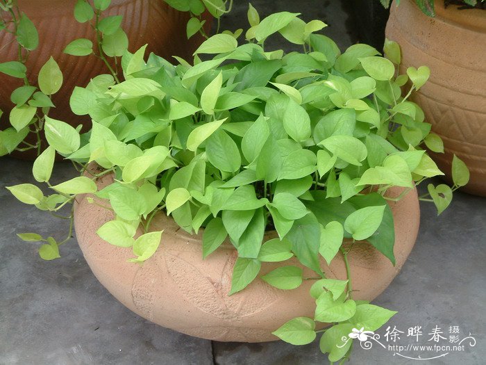 形态特征(Description):常绿草质藤本。下侧叶片较大。叶卵形至长卵形,先端渐尖,基部心形,叶黄色至黄绿色。肉穗花序。花期春季,极少见花。