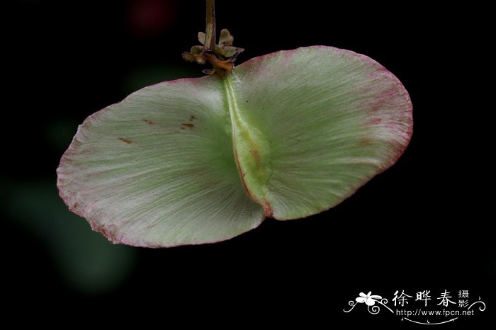 形态特征(Description):藤本。茎具沟棱,幼枝被金黄褐色绒毛,指状复叶互生,有小叶3;叶柄长4-10厘米,密被金黄褐色绒毛。小叶纸质,卵形至倒卵状椭圆形或卵状椭圆形,长6-11厘米,宽3-7厘米,先端钝,基部圆形或近心形,全缘,上面中脉被短柔毛,下面中脉稍被毛或无毛,侧脉约4对,两面显著,网脉在下面显著;小叶柄长0.3-1.5厘米,密被金黄褐色绒毛。聚伞花序组成的圆锥花序腋生,狭长,较叶柄长,密被金黄褐色绒毛,萼片紫红色,长圆形,外面稍被短柔毛,长约8毫米;花瓣与萼片同形,稍短,玫瑰红色;雄蕊5,长6-9毫米,被毛;附属物花瓣状,膜质,先端齿状,背部张口状,具柄;子房下部,花柱长5毫米,被黄色绒毛,柱头波状扩大成鸡冠状;花盘上腺体5,小。果具4翅,翅较大的舌形或近圆形,长2.5-3.5厘米,小的长0.5-1厘米。花期(6-) 9-11月,果期12月至次年4-5月。